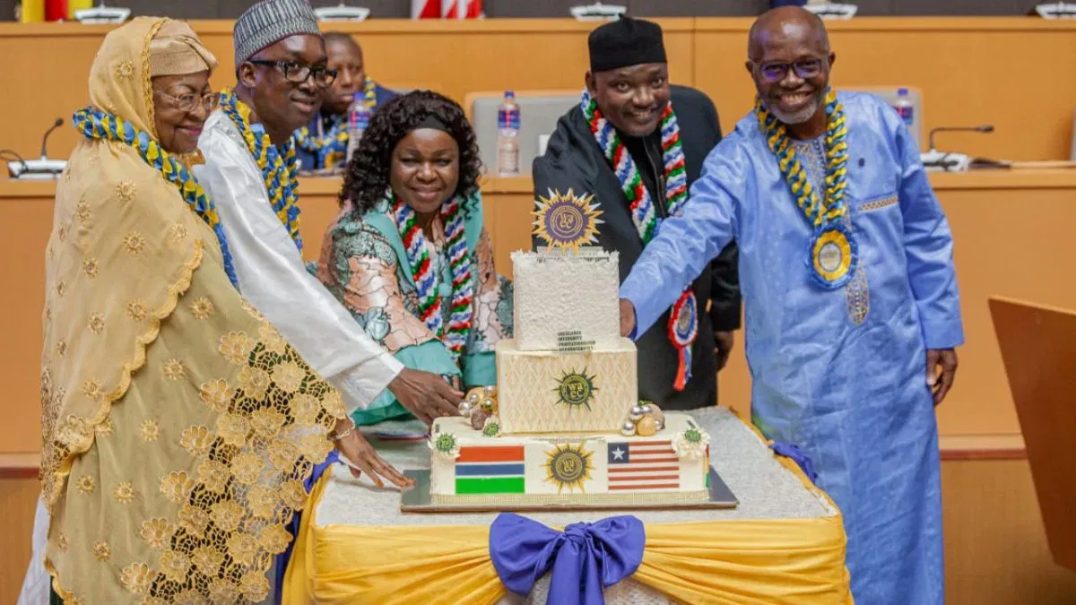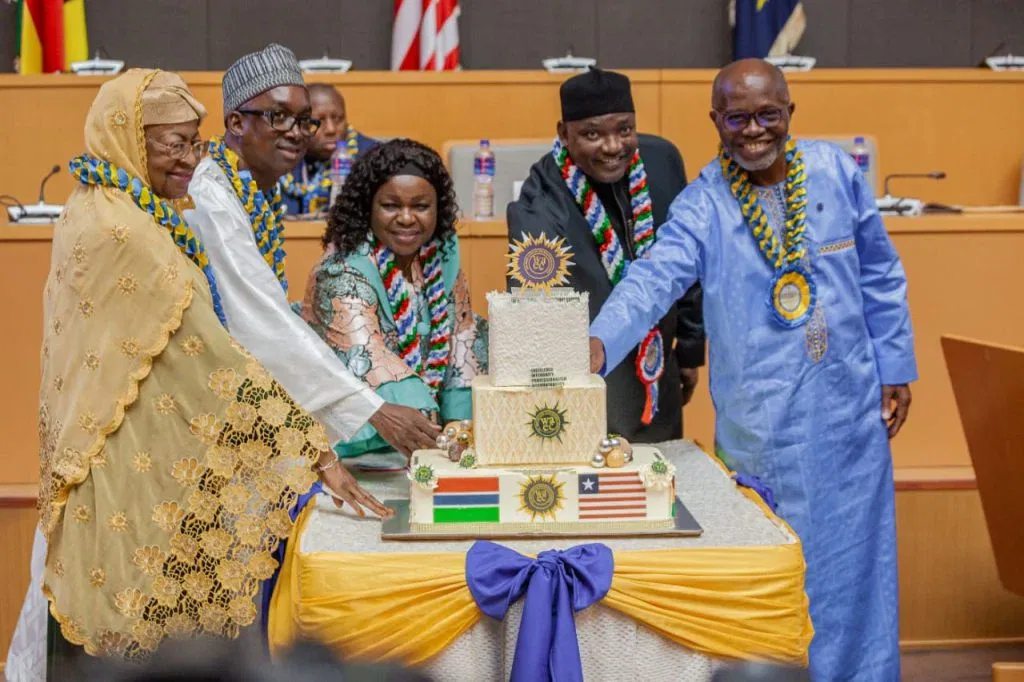2nd from Right, the President of the Republic of The Gambia, Mr. Adama Barrow; in the Middle, Hon. Minister of Basic & Secondary Education, Mrs. Claudiana Cole; 1st Right, Chairman of Council, Prof. Ato Essuman; 1st Left, WAEC Endowment Fund BOT Member, Representing The Gambia, Mrs. Adelaide Sosseh and the Registrar to Council, Mr. Pateh Bah during the Cutting of the 71st WAEC Anniversary Cake.